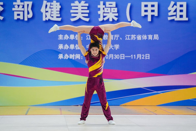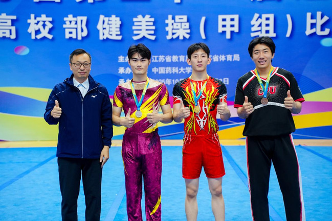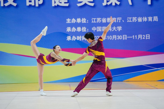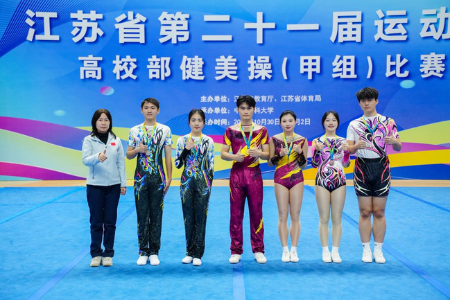 2025年10月30日至11月2日,江苏省第二十一届运动会高校部竞技健美操与啦啦操比赛在中国药科大学圆满落幕。我校代表队在竞技健美操、花球啦啦操、技巧啦啦操三大项目中,凭借精湛的技艺和顽强的拼搏精神,在赛场上绽放光彩,取得优异成绩,以实力谱写了青春华章。